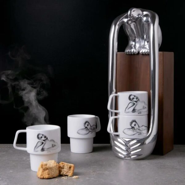 The Carrol Boyes 4 Mug Holder At Full Stretch is a functional art piece that combines sculptural design with everyday utility. Crafted from polished aluminium and set on a solid acacia wood base, it features a striking figure stretching out its arms to cradle four porcelain mugs.