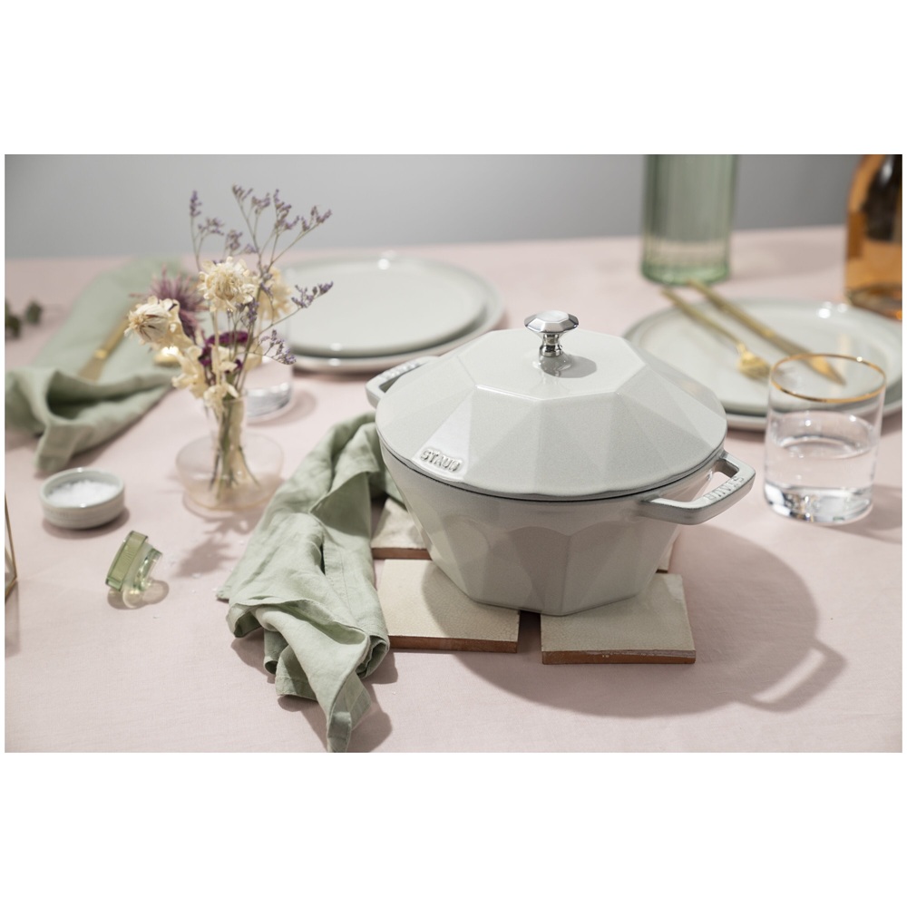 The Staub Cast Iron Diamond Cocotte 2.8l is truly exceptional: shaped like a diamond, with a sparkly knob that repeats the design, it is a real eyecatcher on the dining table. The white truffle colour is a perfect match – after all, French gourmet Brillat-Savarin once called truffles the “diamond of the kitchen”.