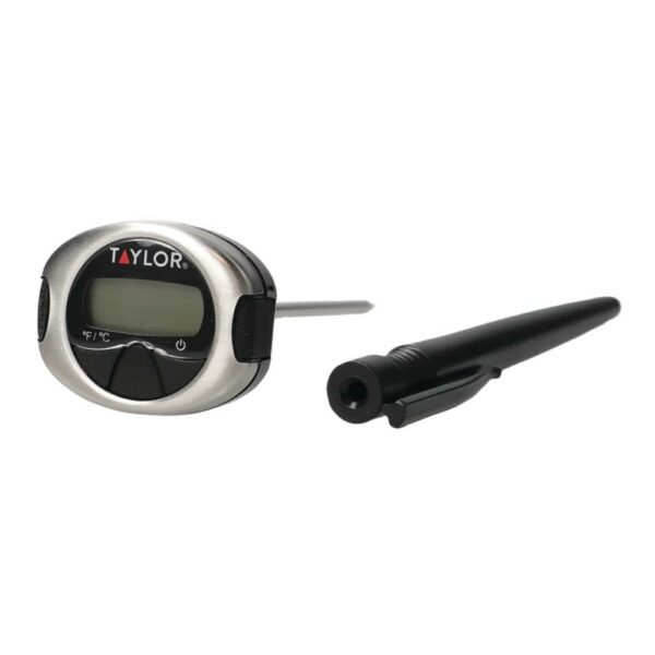 The Taylor Pro Professional Thermometer Probe is a compact, precise, and reliable tool for home and professional kitchens. Designed with a stainless steel probe and durable plastic housing, it delivers fast and accurate temperature readings from 50ยฐC to 230ยฐC. Its digital LCD display clearly shows readings, and the hold function locks the current temperature for easy recording. Switch effortlessly between Celsius and Fahrenheit with the touch of a button.