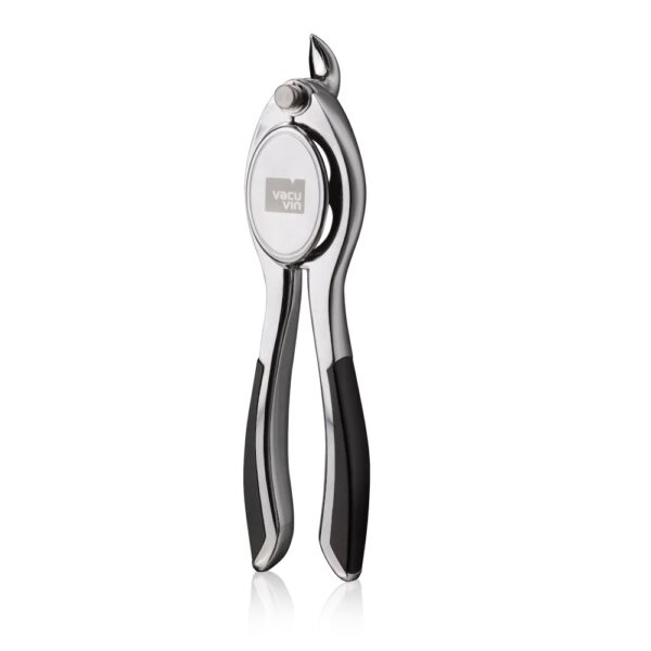 The Vacu Vin Champagne Bottle Opener is a sleek, ergonomic tool designed for safe and controlled removal of champagne and sparkling wine corks. Its lever-based mechanism clamps the cork and wire cage, allowing you to extract the cork smoothly in one motion, avoiding sudden pops and spills.
